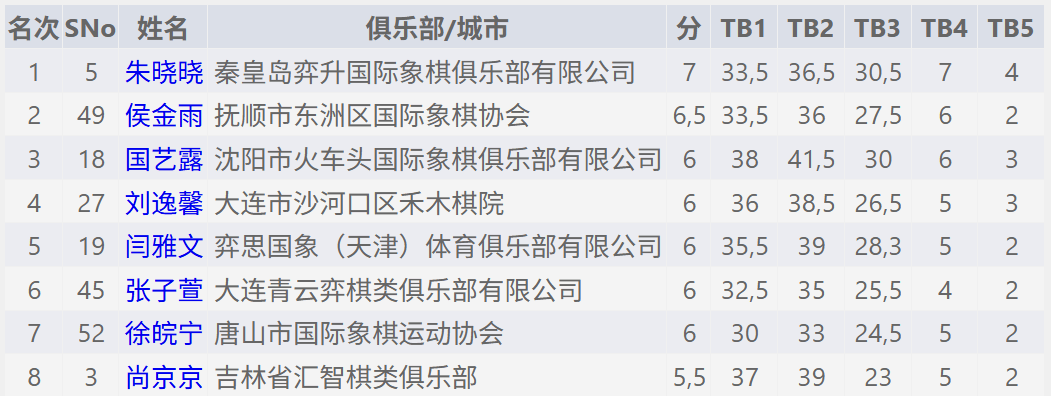 女子候补棋协大师组有51名棋手参加(不满80人)——前8轮结束后,暂居前8名的棋手如下,其中前4名棋手已经提前一轮晋级棋协大师。