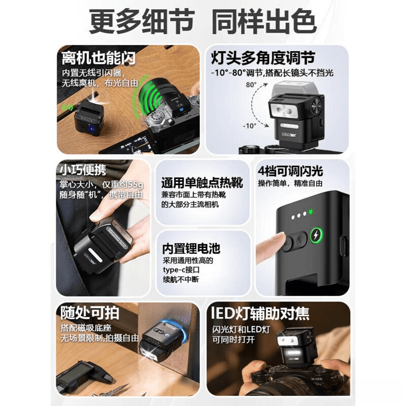 通过热靴接口兼容多种相机,极大地方便了不同品牌用户的使用。无论你的相机是什么型号,这款闪光灯都能迅速搭配,帮助你在各类环境下进行创作。相机与闪光灯的完美结合,将为你的摄影体验增添无限可能。